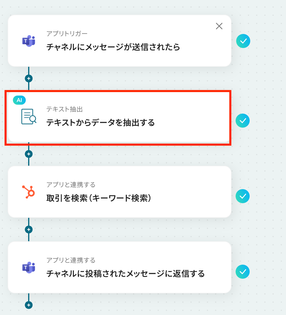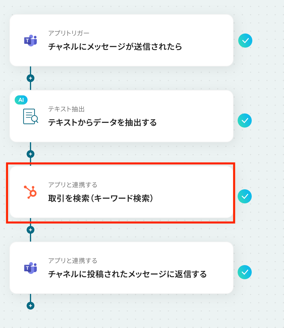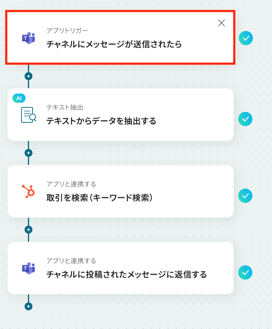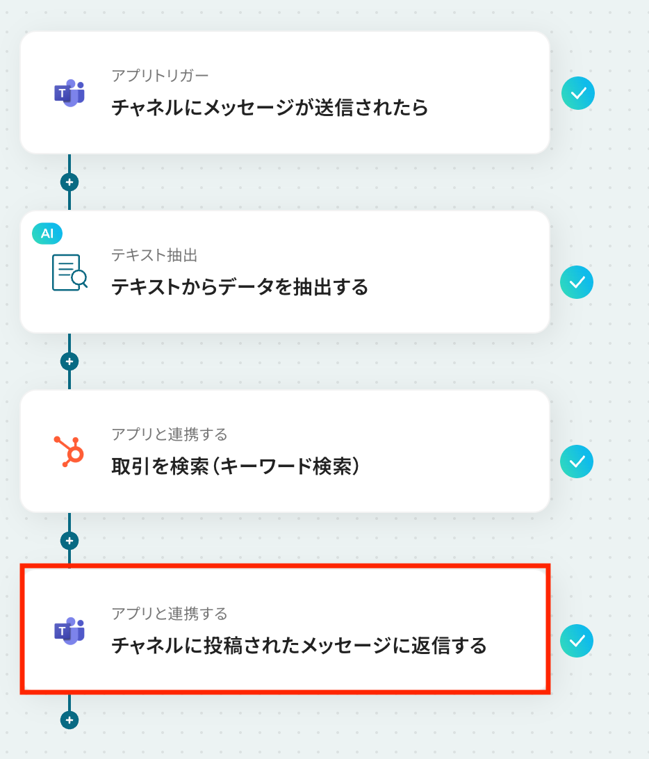 このワークフローを活用すれば、Microsoft Teamsの投稿をきっかけに、HubSpotから自動で取引の情報を取得して、瞬時に返信することが可能になります。