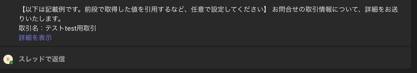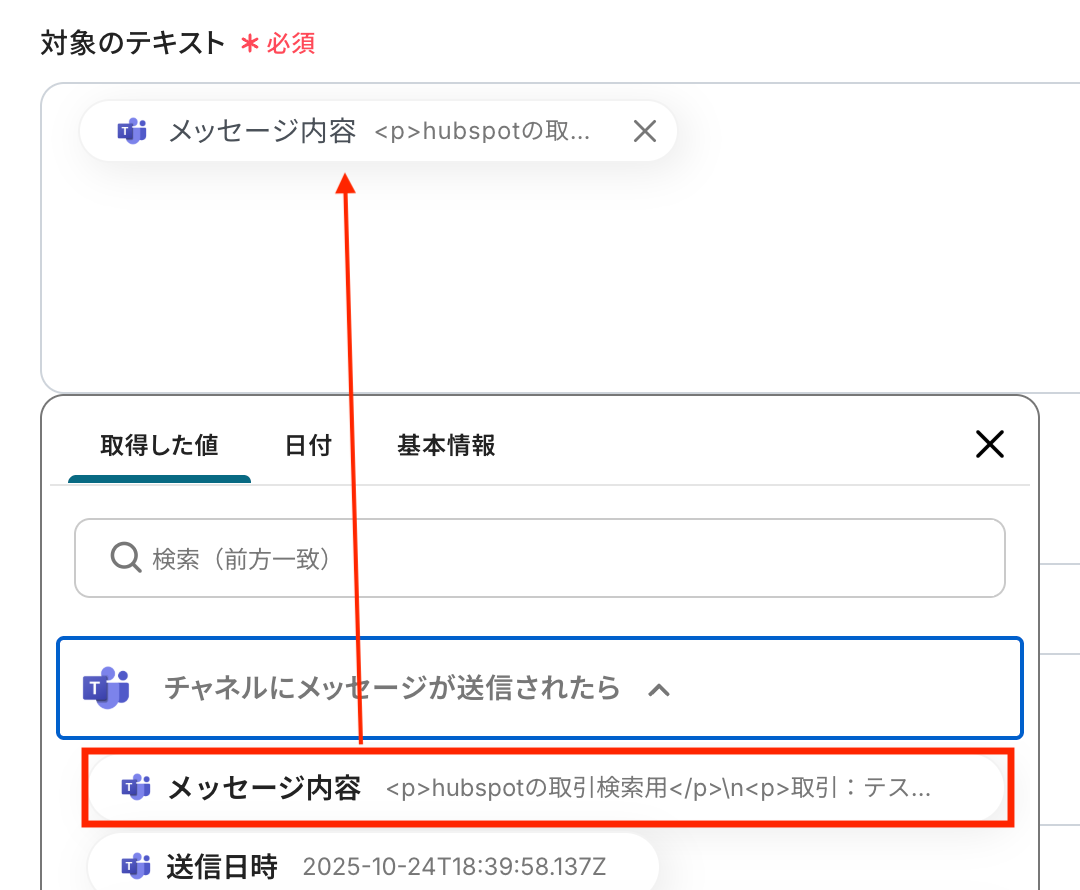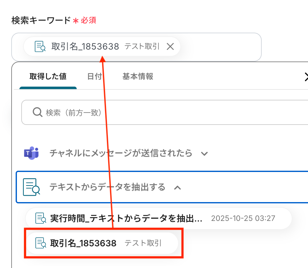このように設定することで、Microsoft Teamsのメッセージに記載された取引名を検索キーワードとして設定できます。