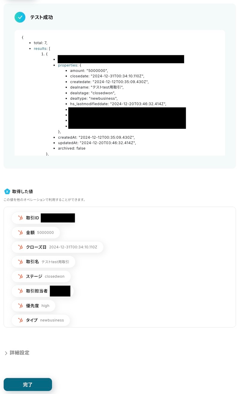 テスト成功を確認します。取引ID・金額・クローズ日・取引名・ステージ・担当者・優先度・タイプが取得できていれば「完了」をクリックします。