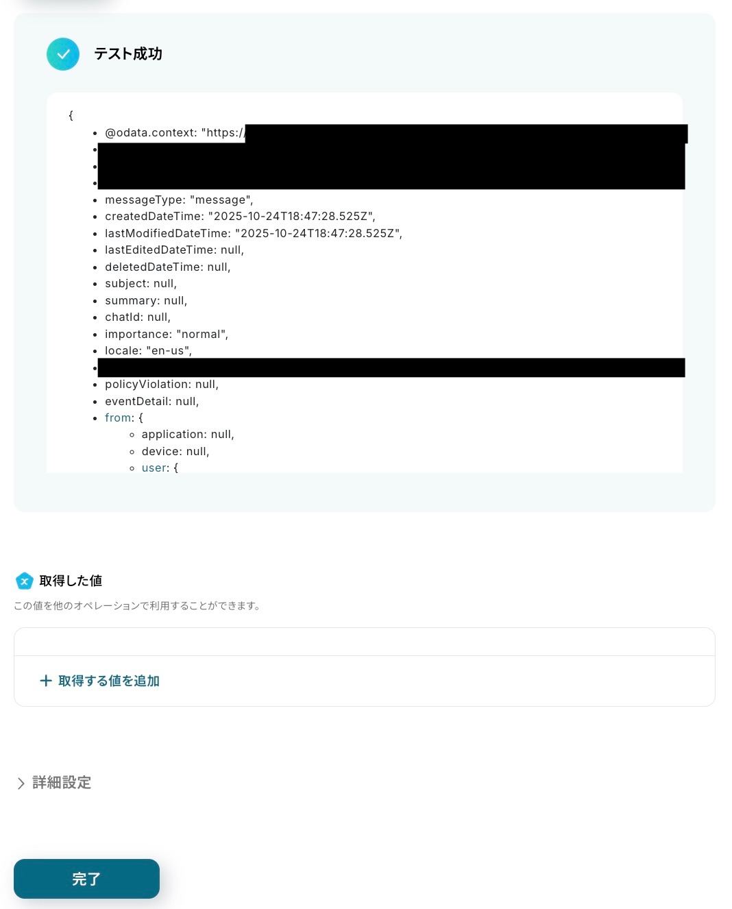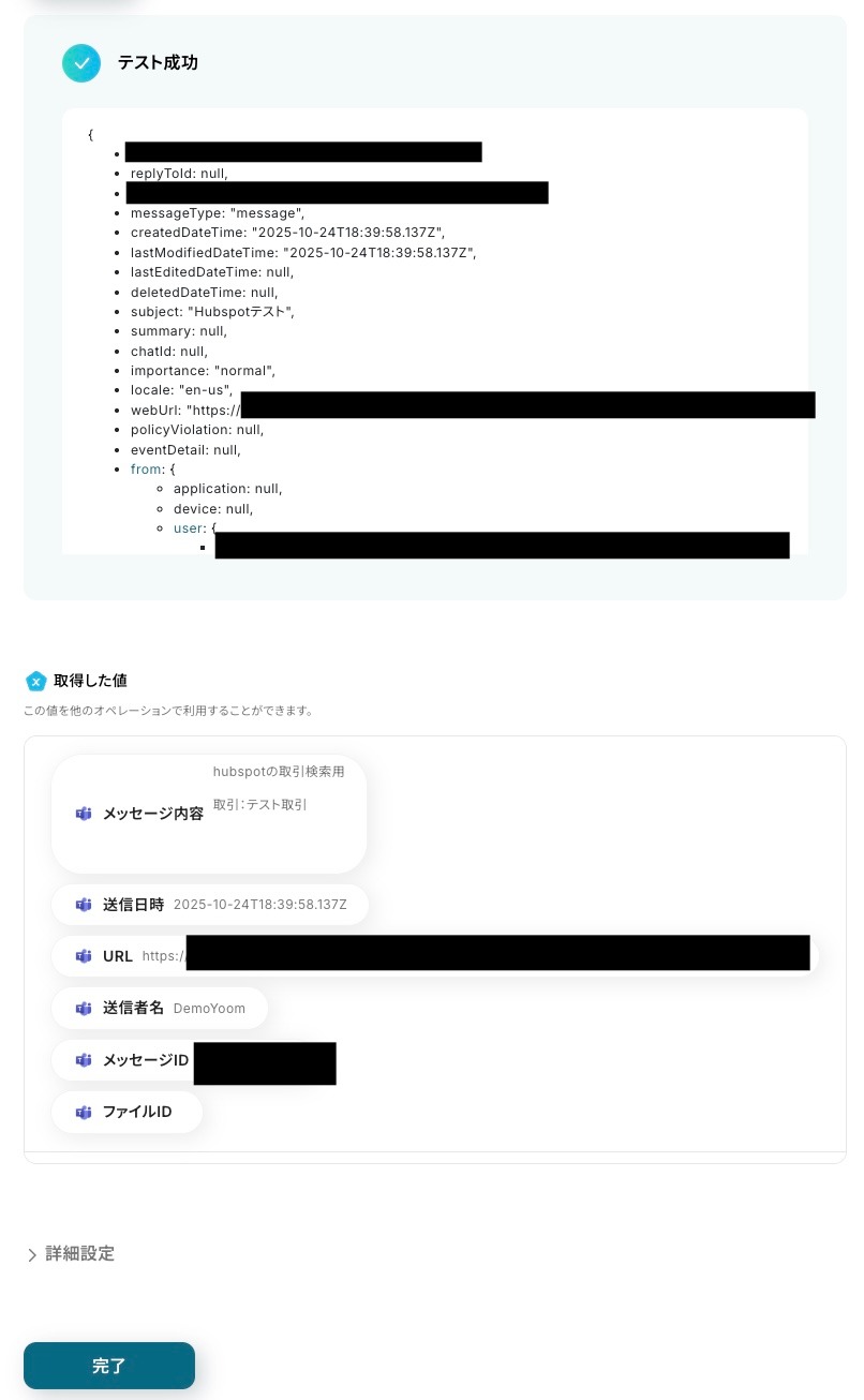 テスト成功を確認します。メッセージ内容や日時、URL、送信者名、メッセージIDが取得できていれば「完了」をクリックします。