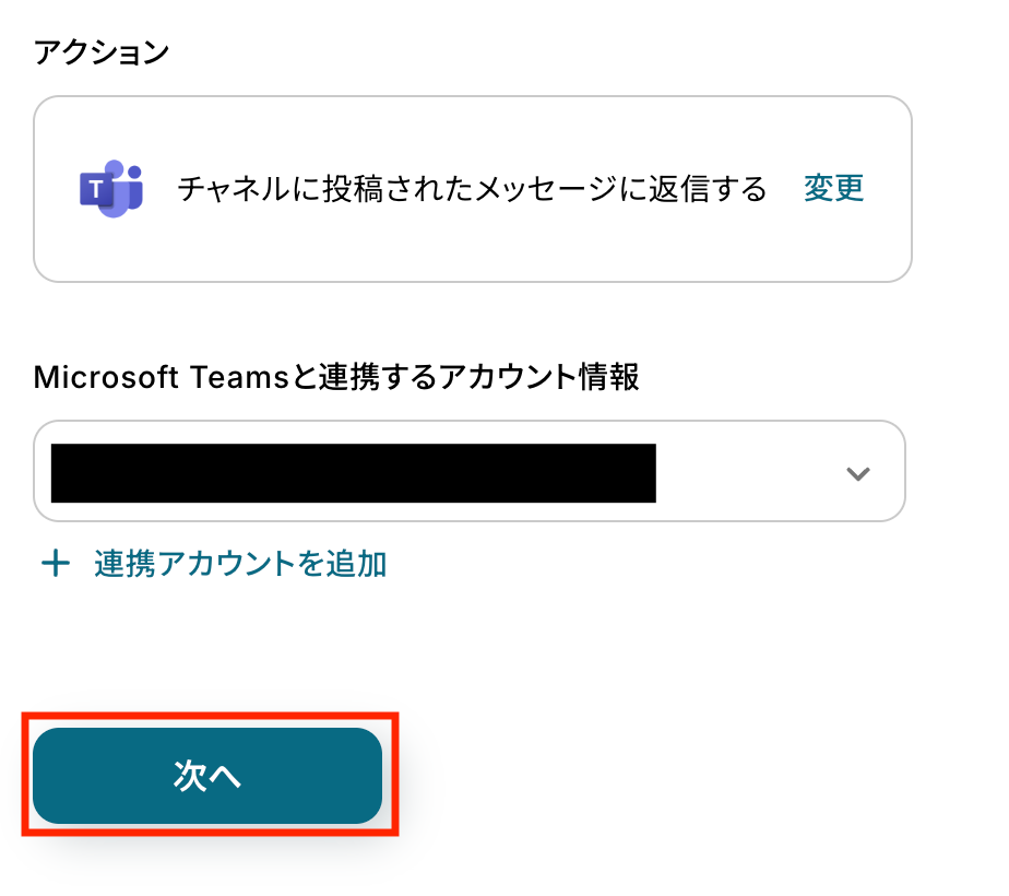 接続するMicrosft Teamsアカウントを選び「次へ」をクリックします。