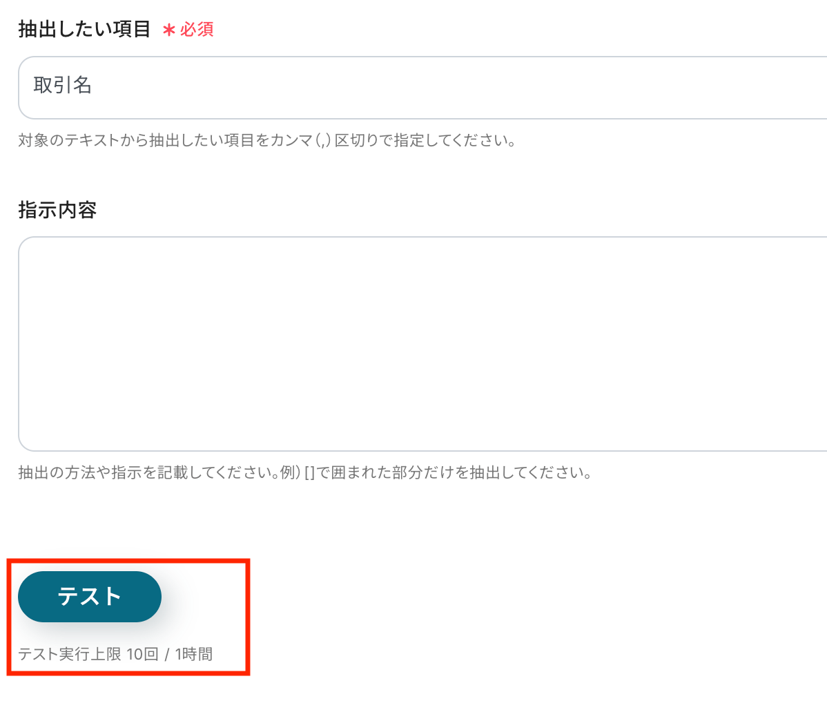 また、今回はHubSpotに取引情報を自動要録したいため、抽出したい項目は「取引名」と設定しました!必要なら下の欄に抜き出し方の指示を書きます。
