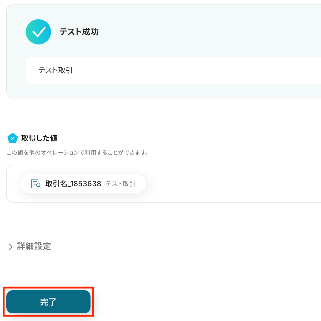 テストを実行し、想定どおり取引名が取得できることを確認して「完了」をクリックします。