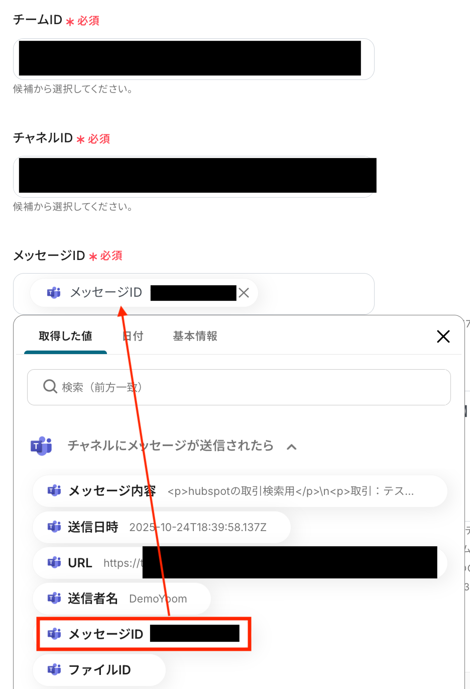 チームID・チャネルID・メッセージIDに、最初のトリガーで取得した値を選んで差し込みます。