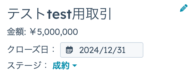 HubSpot側の取引例を確認し、金額やクローズ日、ステージが入っていることを把握します。