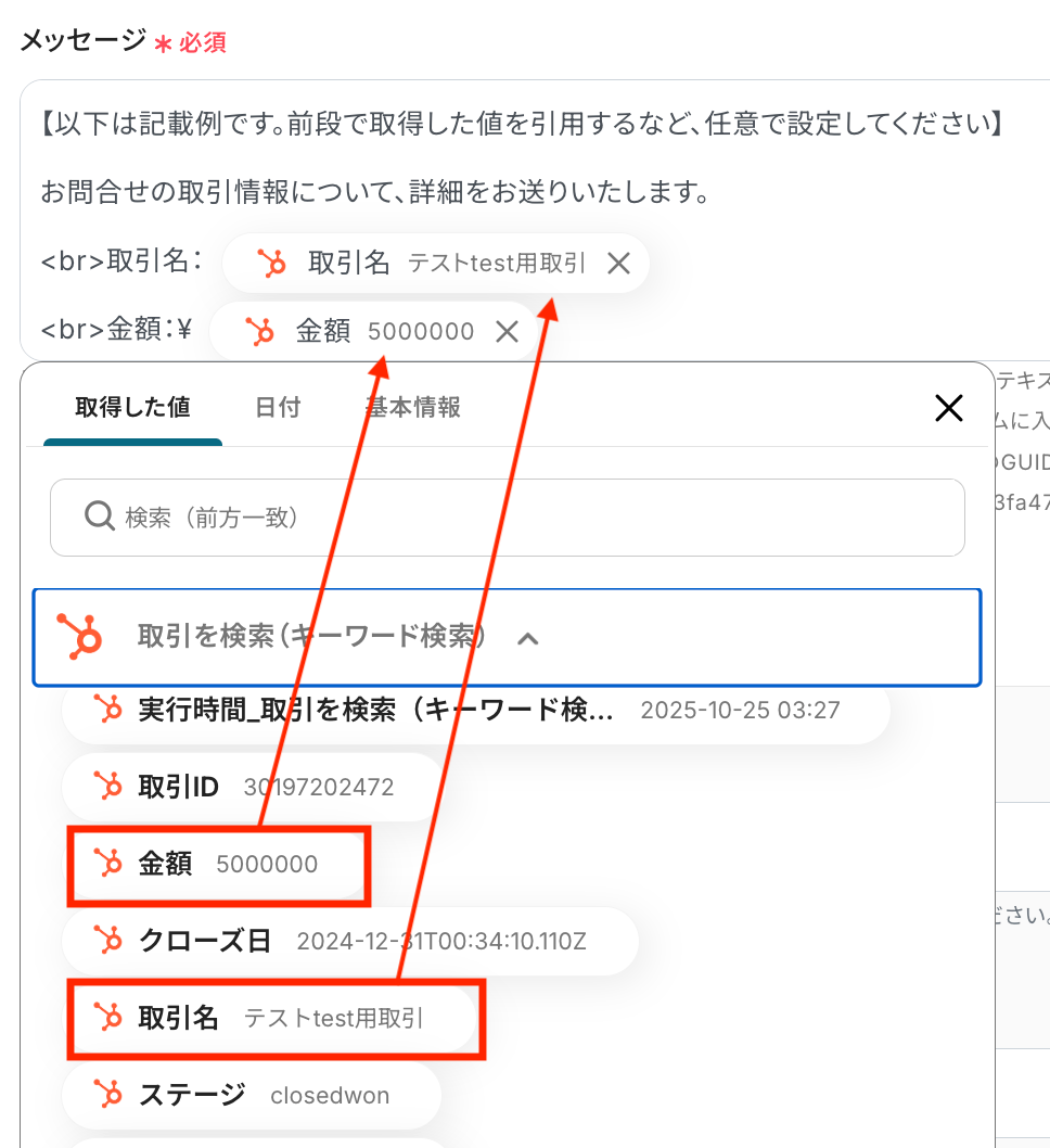 メッセージ本文に、HubSpot検索の「取引名」や「金額」を差し込みます。案内文は読みやすく整えますしょう。