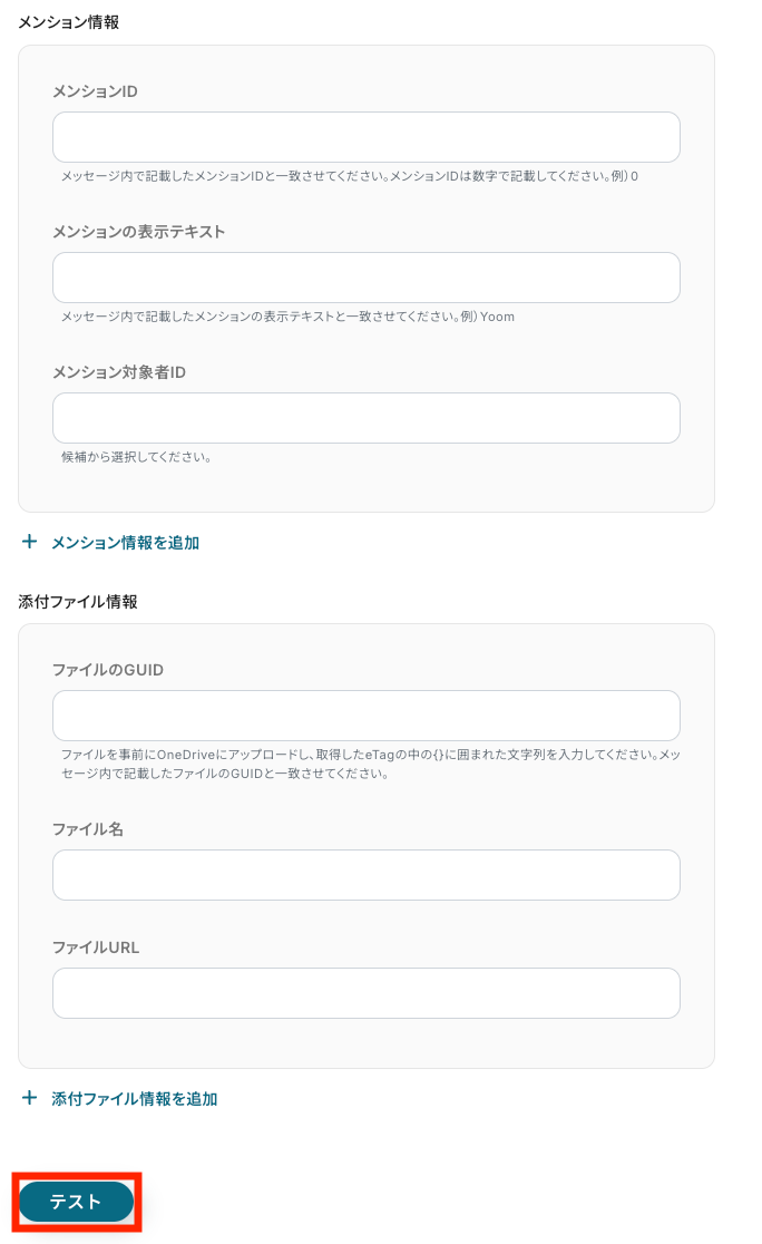必要に応じてメンションや添付ファイル情報を入力し、テストで送信できることを確かめます。