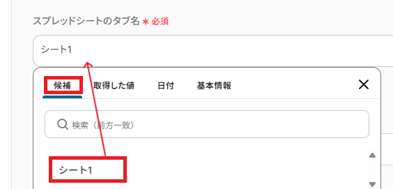 「スプレッドシートのタブ名」も、候補から選択してください。