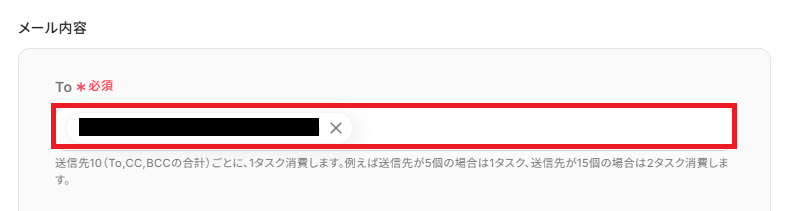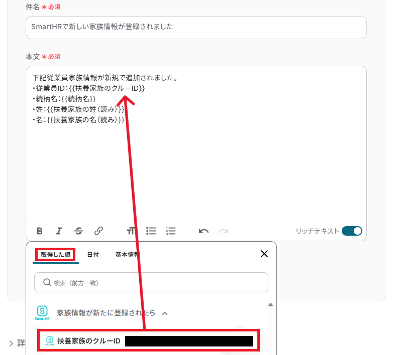 「件名」と「本文」は、下図のように取得した値を活用して自由に入力できます。