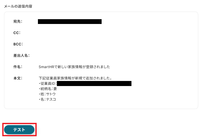 内容に誤りがないか確認し、問題なければ「テスト」を押してください。