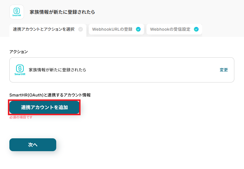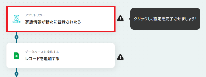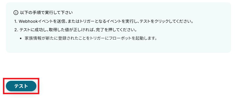 以下の画面に移行するので、トリガーとなるイベント(家族情報を新たに登録する)を実行しましょう。