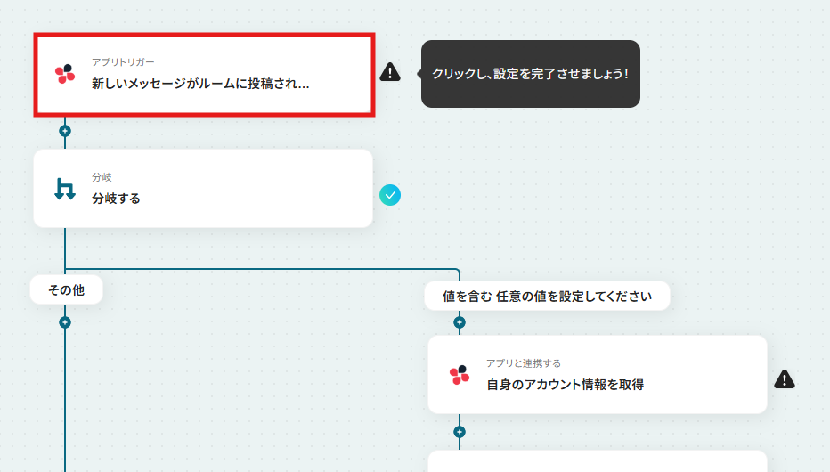 ChatworkとYoomを連携してください。 分岐はミニプラン以上のプランでご利用いただける機能(オペレーション)となっております。フリープランの場合は設定しているフローボットのオペレーションはエラーとなりますので、ご注意ください。 ミニプランなどの有料プランは、2週間の無料トライアルを行うことが可能です。無料トライアル中には制限対象のアプリや機能(オペレーション)を使用することができます。