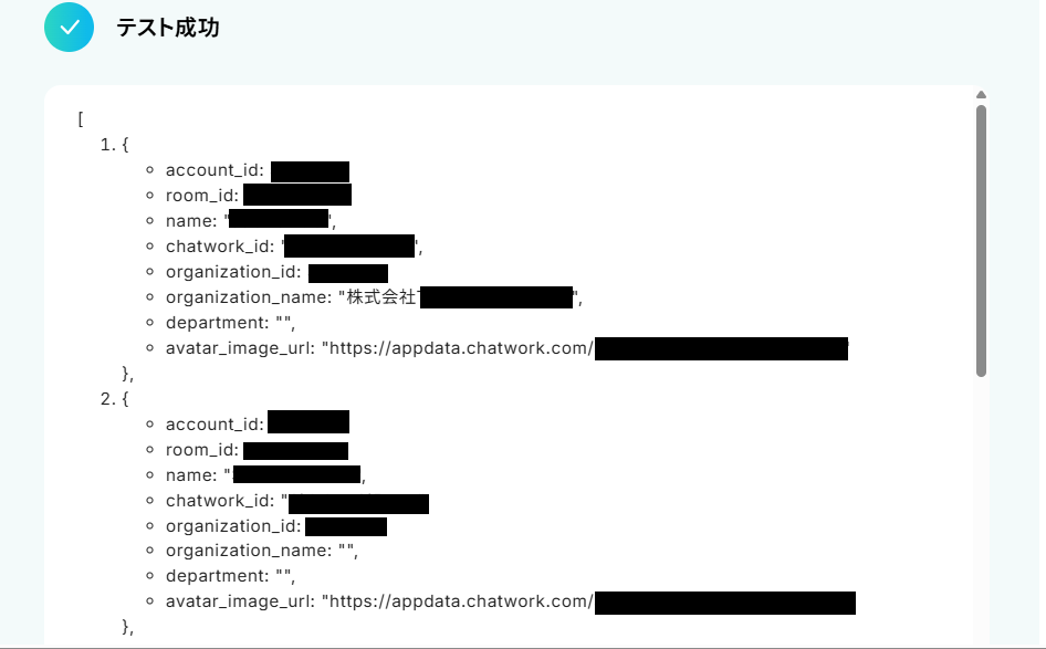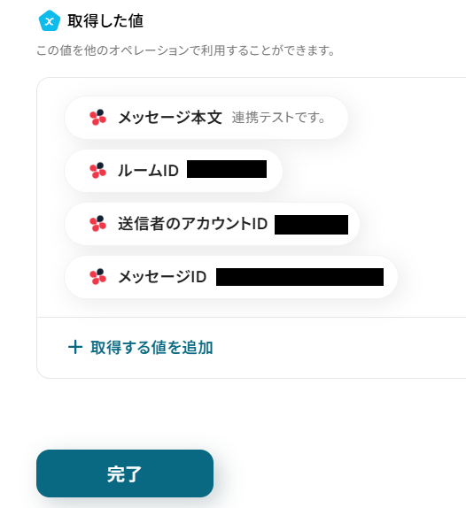 テストが成功すると、取得した値にChatworkの連絡先(コンタクト)の一覧が表示されます。 確認後、「完了」ボタンをクリックしてください。