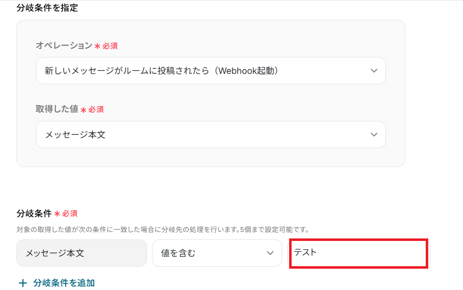 分岐条件の赤枠部分に、分岐させたい特定のワードを手入力で設定します。 今回は例として、「テスト」というワードを含むメッセージの場合に分岐するよう設定してみました! ここまで設定が確認できたら「完了」ボタンをクリックしてください。