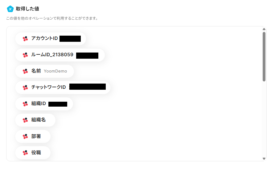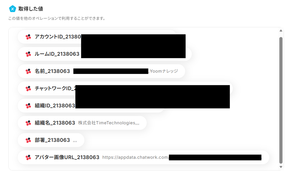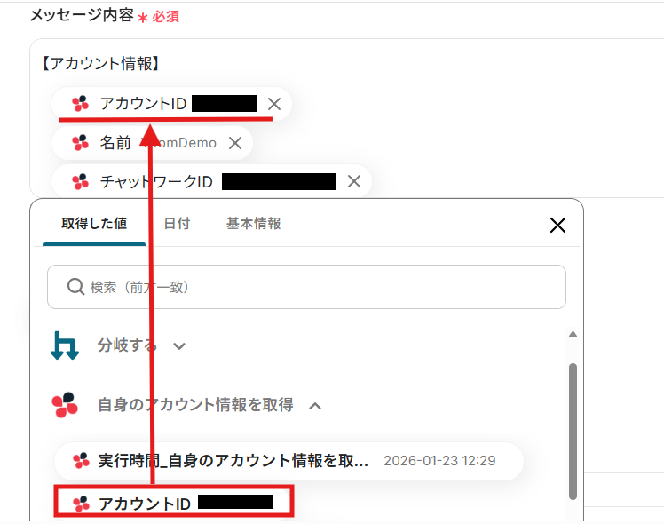 メッセージの内容は、自由に設定することが可能です。 デフォルトの設定では、取得した値を活用し、ご自身の「アカウントID」「名前」「チャットワークID」と、コンタクト一覧の「名前」を自動でChatworkに通知することができるように設定されています。 用途に合わせてメッセージの内容や取得するアウトプットを変更してご利用ください。 ※取得した値を活用することで値が固定化されず、フローボットを起動するたびに最新の情報を自動で反映 できます。 メンションを使用することも可能です。