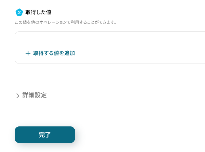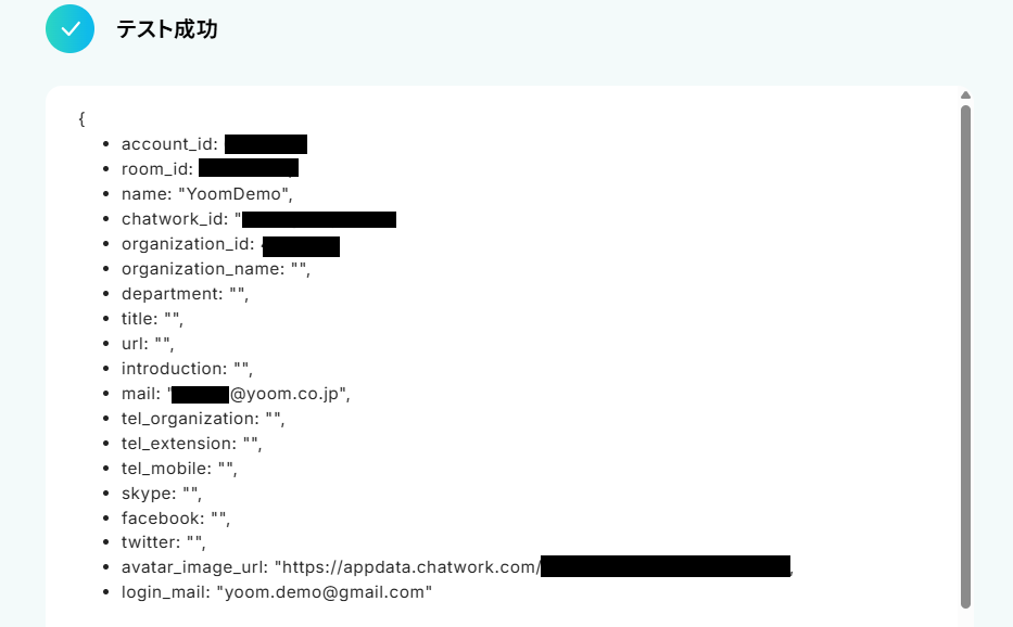 テストが成功すると、取得した値にご自身のアカウント情報が表示されます。 確認できたら「完了」ボタンをクリックしましょう。
