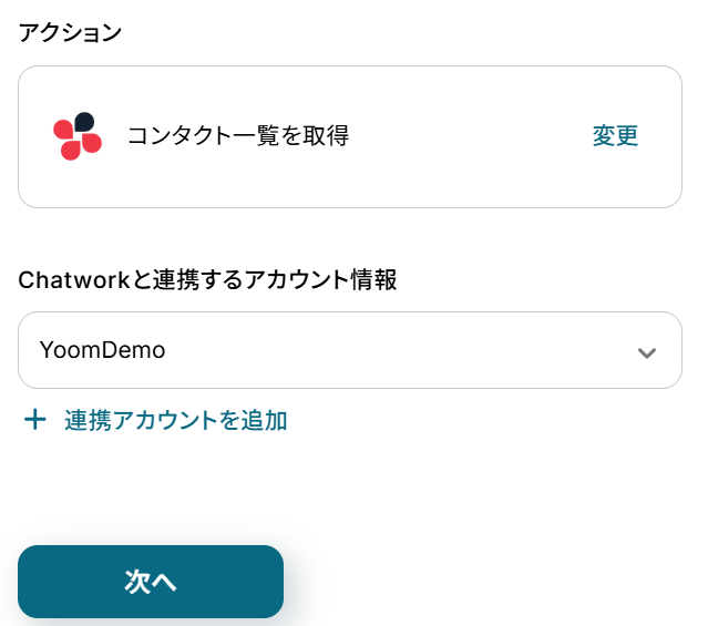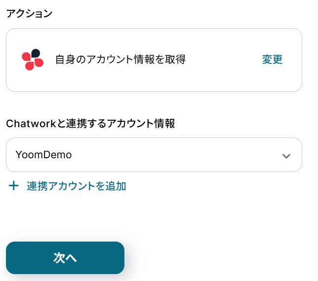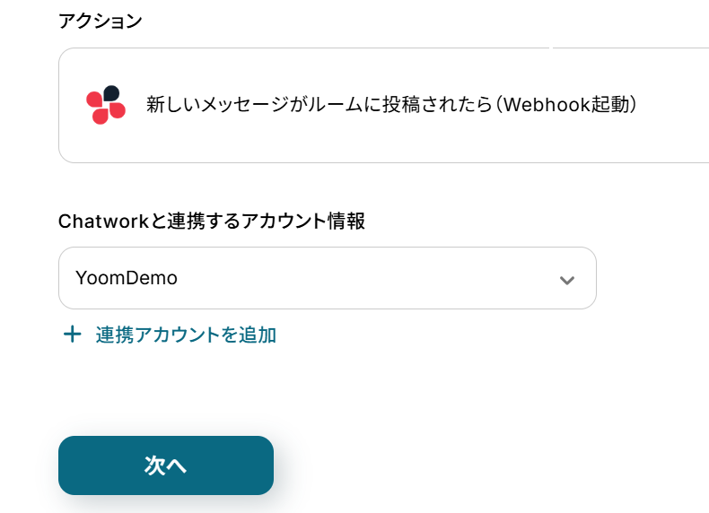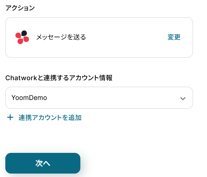 アクションはあらかじめ設定されています。 Chatworkと連携するアカウント情報に誤りがないことを確認し、「次へ」をクリックしてください。