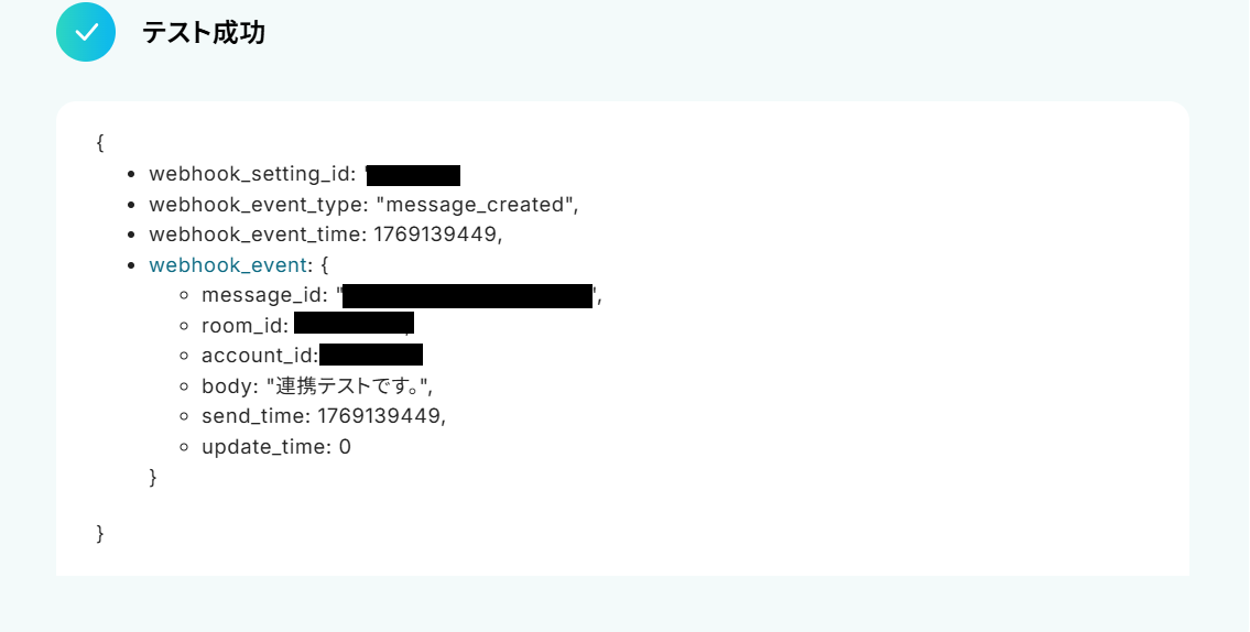 Webhookの設定が完了したら、トリガーの動作テストを行います。 Chatworkにテスト用のメッセージを作成してください。