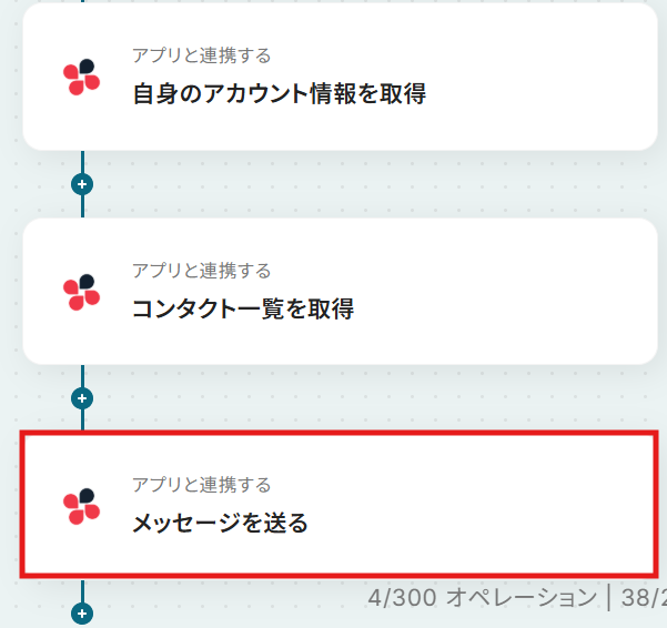 いよいよ最後の設定です! 先ほど取得したChatworkのアカウント情報とコンタクト一覧を引用し、自動でChatworkに通知する設定を行いましょう。 「メッセージを送る」という項目をクリックしてください。