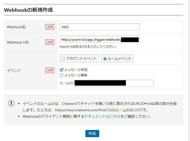 Webhookを作成する画面が表示されます。 Webhook名は、任意の名前を設定してください。 WebhookURLの欄に先ほどYoomの画面でコピーしたURLをペーストしましょう。 イベントは、「メッセージ作成」を選択し、使用したいルームIDを設定します。