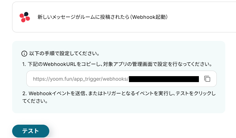 Webhookの設定を行います。 画面に表示されているWebhook URLをコピーし、Chatworkの画面を開いてください。