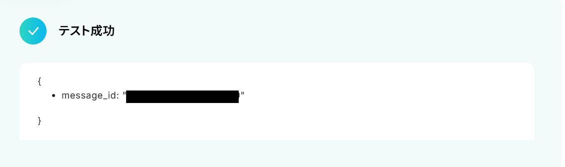 Yoomの画面に戻り、テストを実行します。 テストが成功すると、先ほど作成したメッセージの情報が取得した値に表示されるので、確認してください。 ※取得した値 とは、トリガーやオペレーション設定時に、「テスト」を実行して取得した値のことです。 後続のオペレーション設定時の値として利用でき、フローボットを起動する度に変動した値 として引用できます。