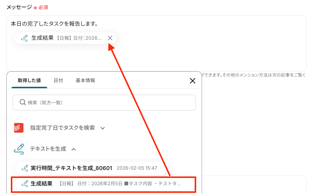 - 最後に、オペレーションでTodoistの「タスクを作成」アクションを設定し、前のステップで生成した内容などを活用してタスクを登録します