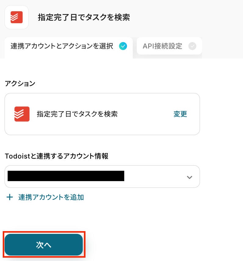 アクションはそのままで、連携するアカウント情報を確認します。