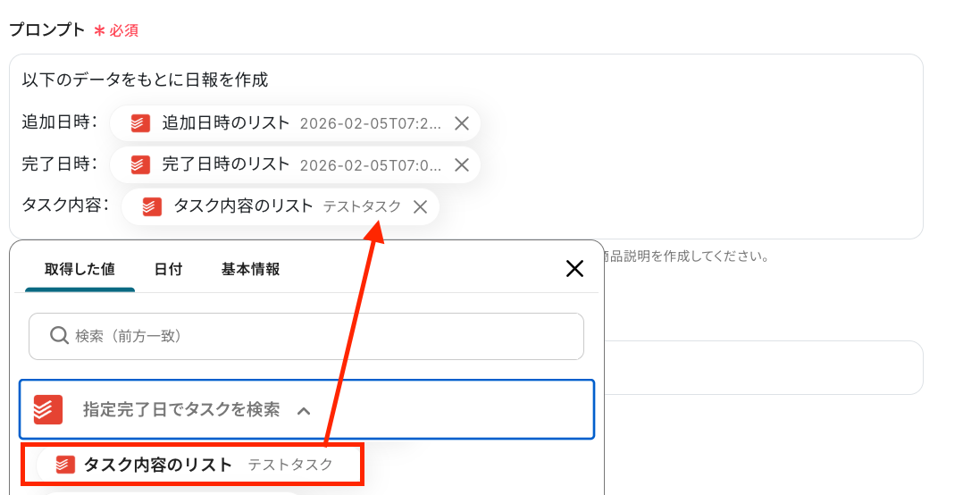 - Todoistでタスクを作成する際に、AI機能で抽出したデータを元に、タスクのタイトルや説明、期日などを自由にマッピングしてください。
