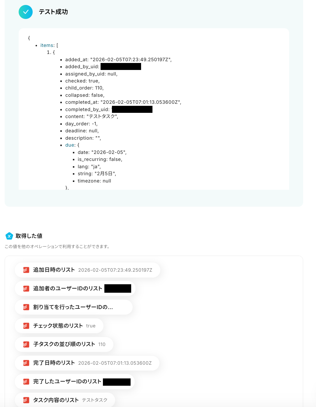 Todoistのアクションでテスト自体は成功しますが、取得される値は空欄となります。