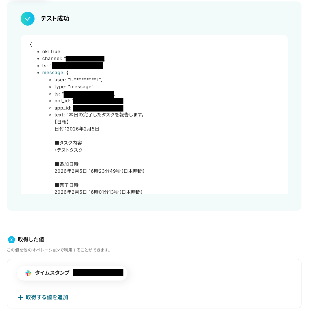 このワークフローを活用すれば、Slackに投稿されたメッセージから必要な情報を抽出し、Todoistの関連タスクに自動で追加できるようになります。