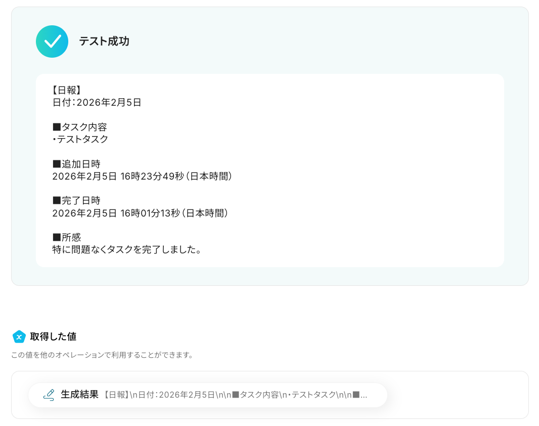 - 次に、取得したタスク情報を基に、AI機能でSlackに通知する日報形式のテキストを生成するためのマニュアル(指示)を作成する