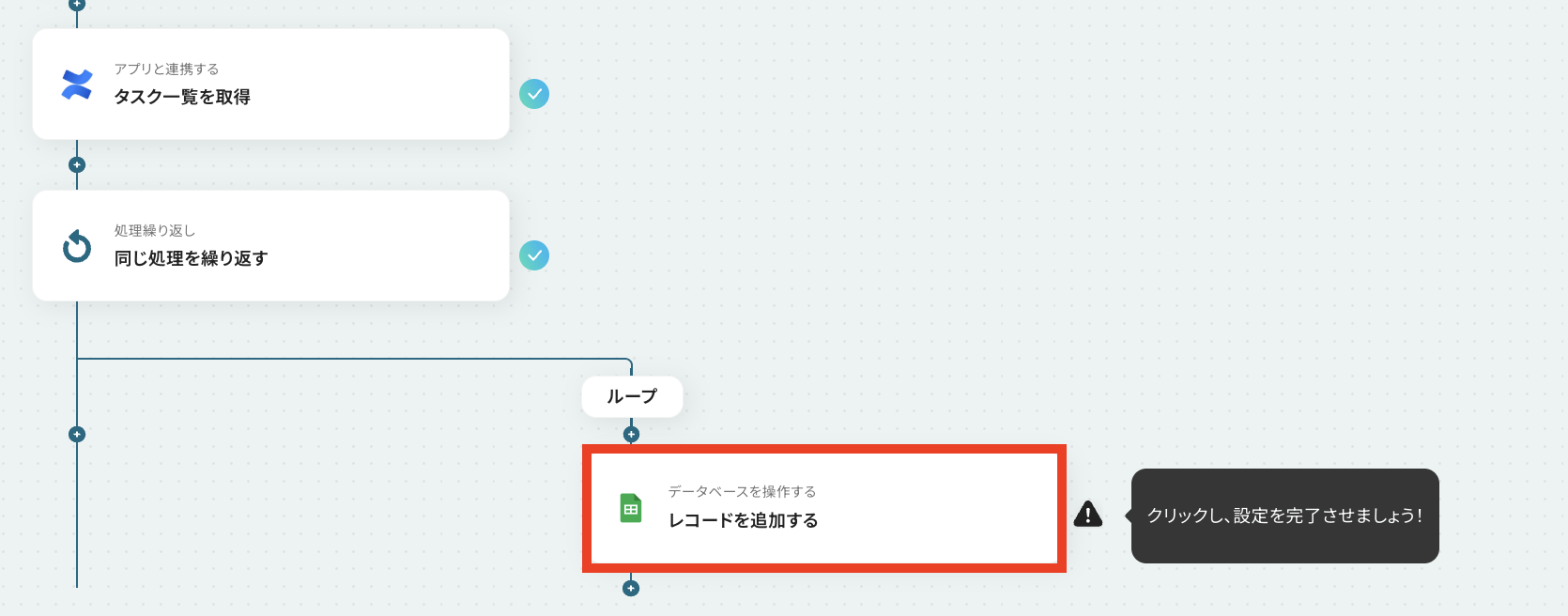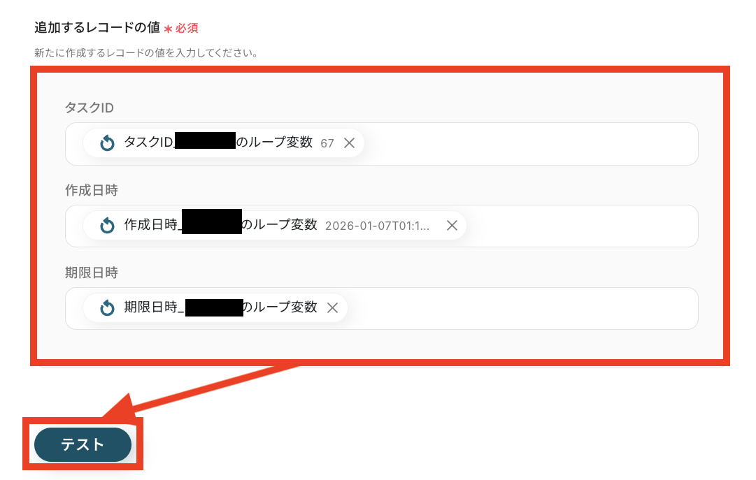 - 最後に、同じく繰り返し処理の中で、Google スプレッドシートの「レコードを追加する」アクションを設定し、取得したタスク情報を指定のシートに追記します。