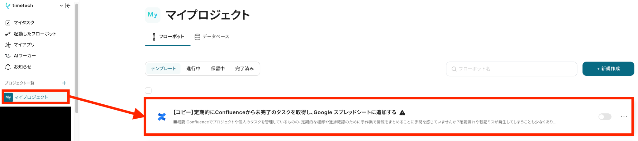 左側にあるメニューの「マイプロジェクト」から、コピーしたテンプレートを開きます。