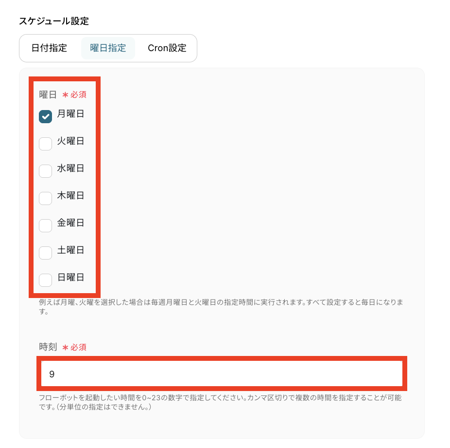 - スケジュールトリガーでは、タスクを転記する曜日や時刻などを自由に設定できます。