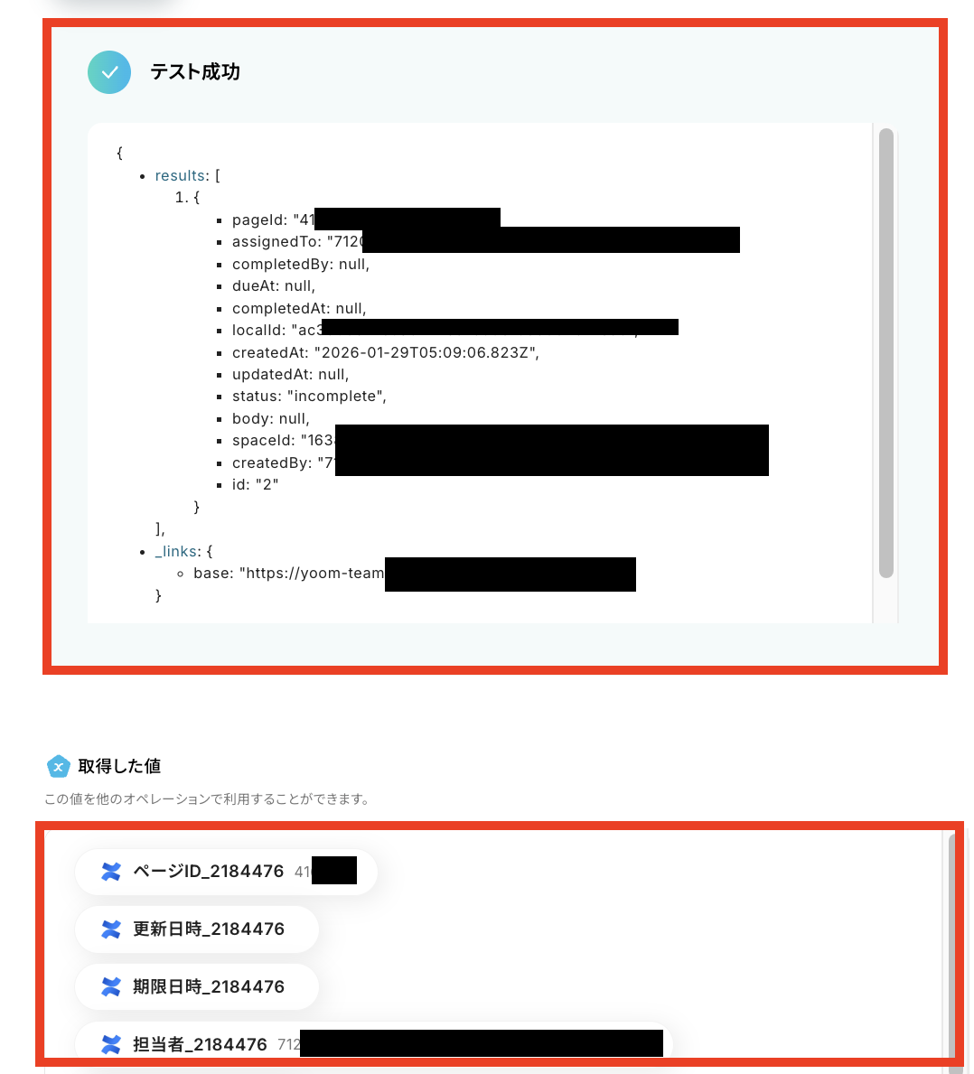テストに成功すると、設定した条件に一致するConfluenceのタスクデータ一覧が「取得した値(※)」の欄に反映されるので、確認できたら「完了」をクリックしてください。