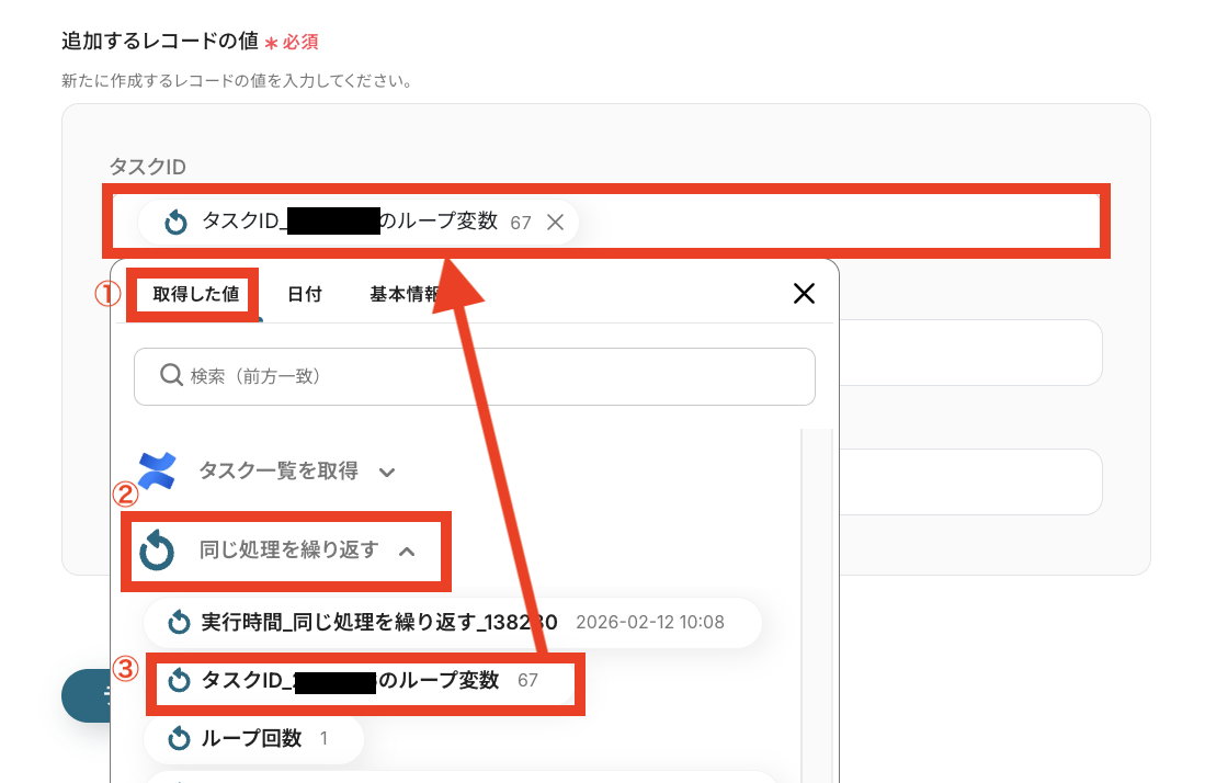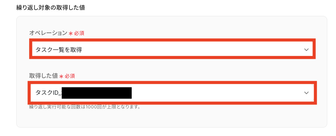 下の画像の通り設定すると、タスクIDを1件ずつなど1件ずつ取得できるようになります!