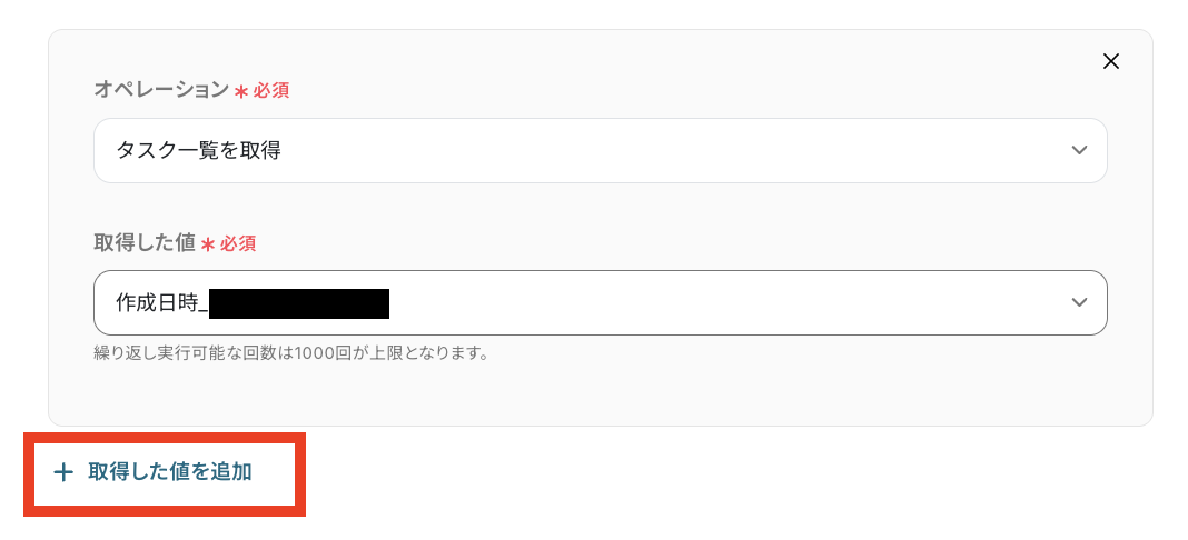 項目を増やしたい場合は「+取得した値を追加」をクリックしてください。