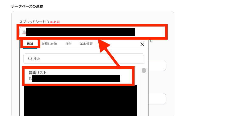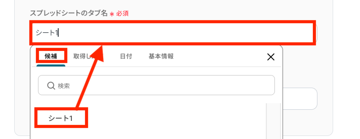 入力欄をクリックすると「候補」の欄に候補一覧が表示されるので、連携したいシートを選びます。