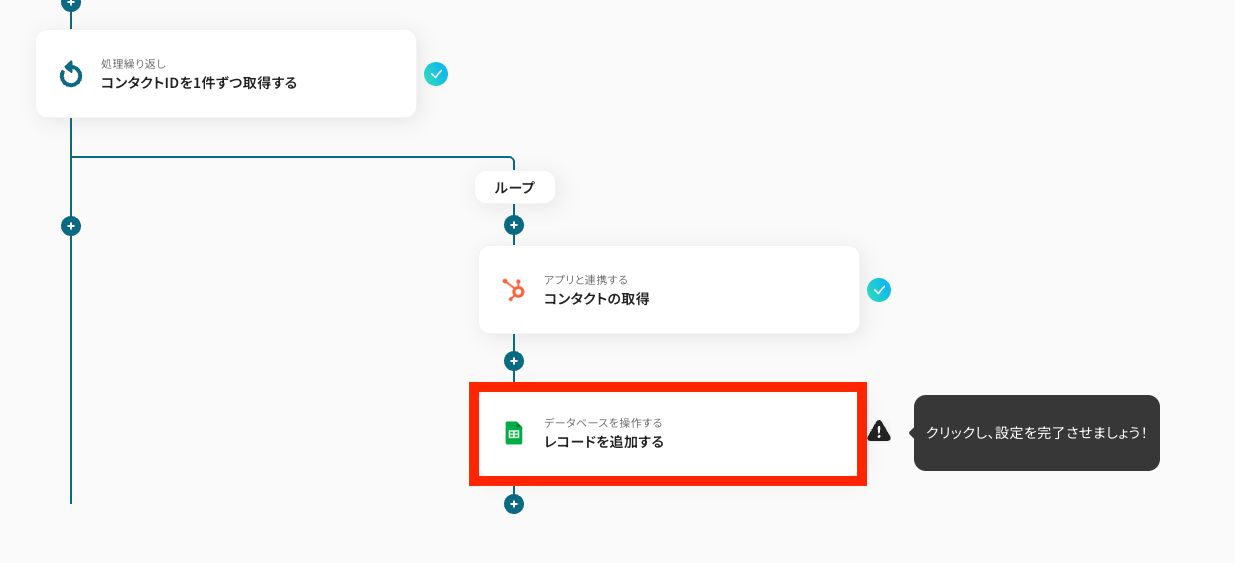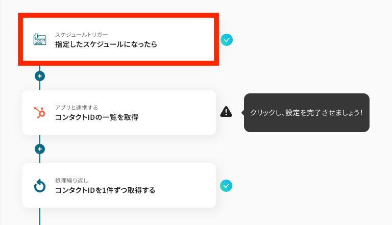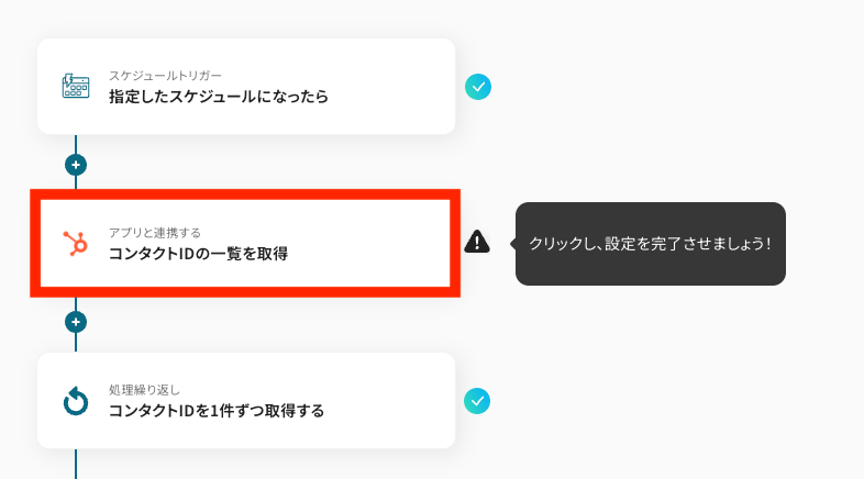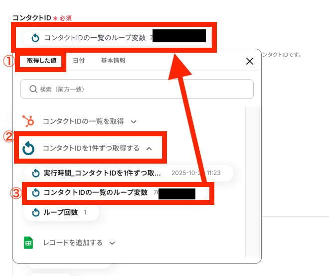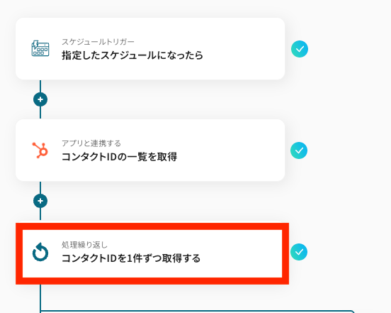 ここでは、ステップ4で取得したHubSpotのコンタクトID一覧を「1件ずつ取得」できるように設定します。