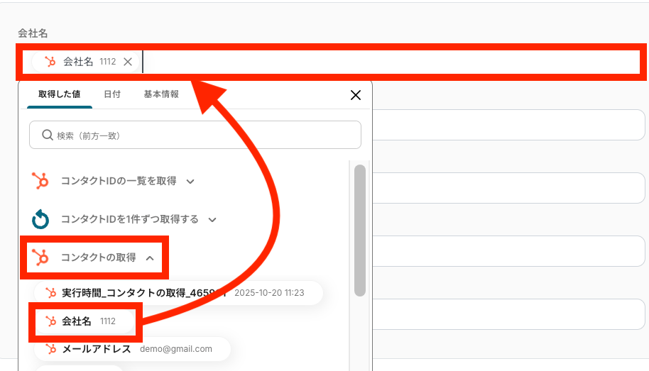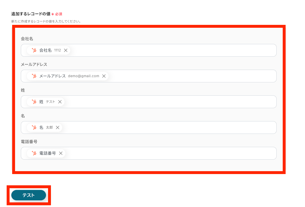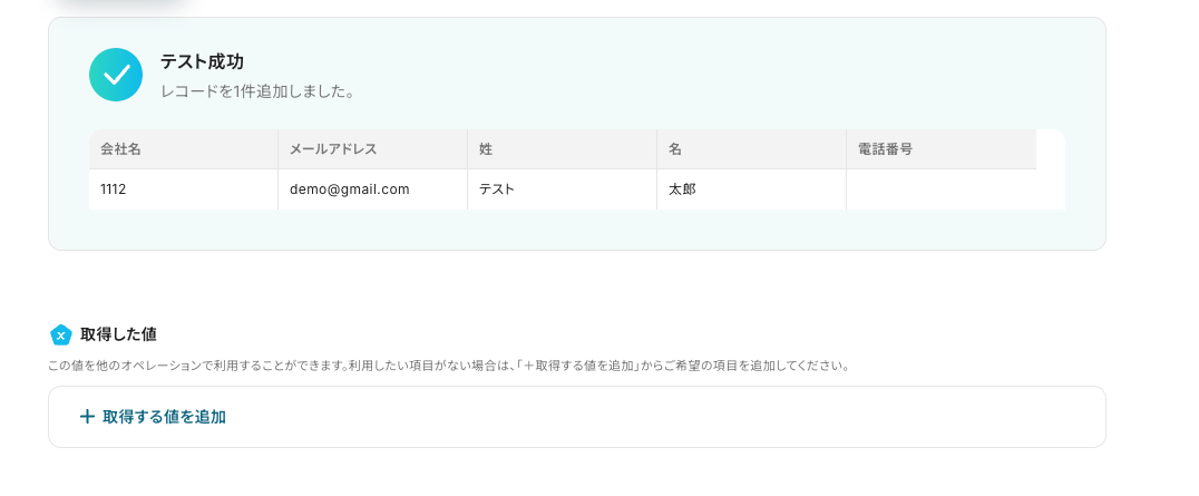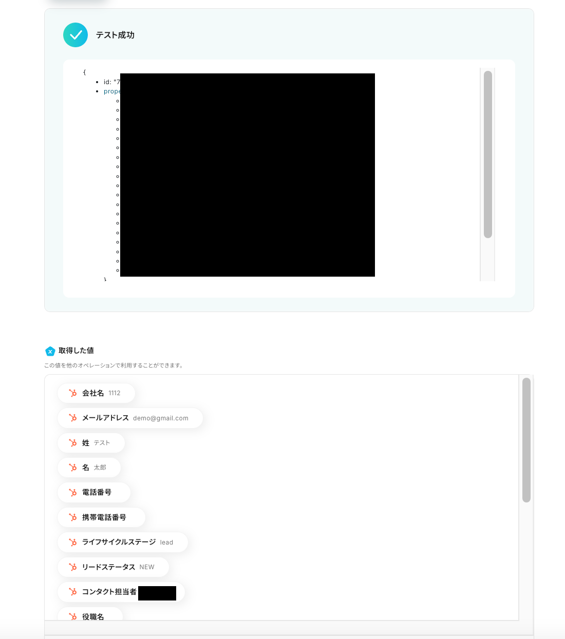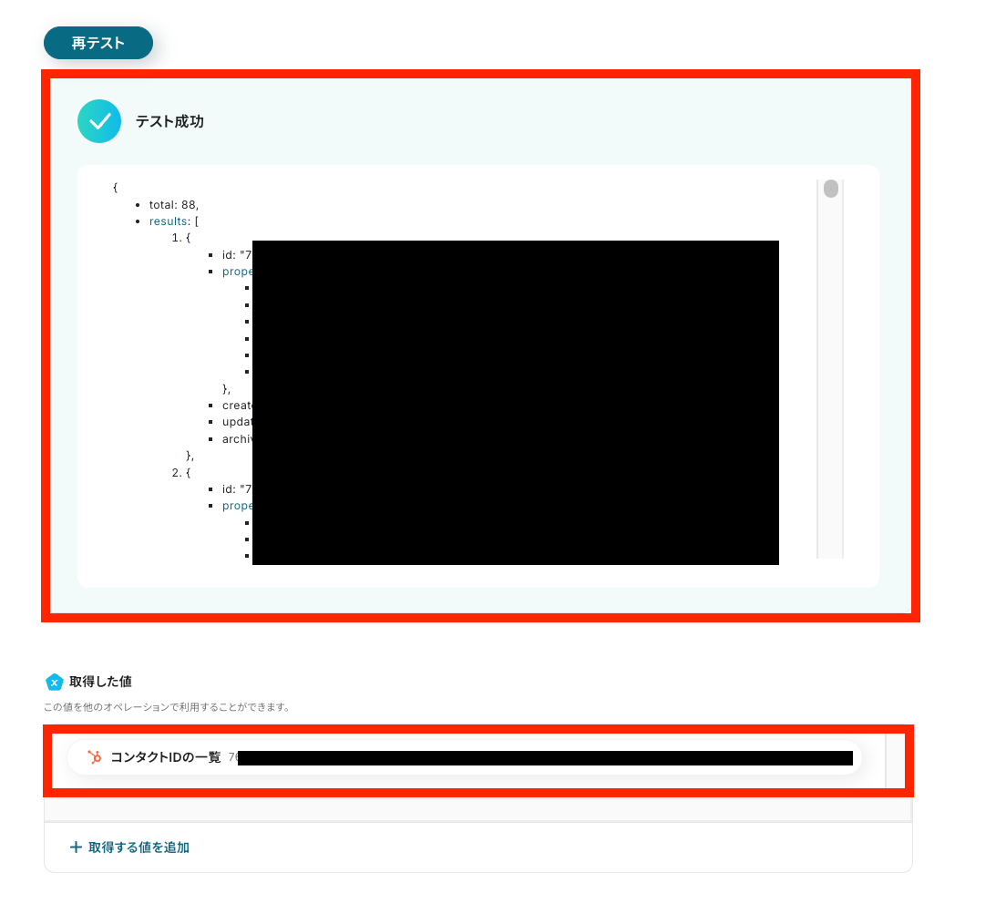 テストに成功すると、テスト成功の文字とともに「取得した値」としてHubSpotのコンタクトIDのデータが反映されます。
