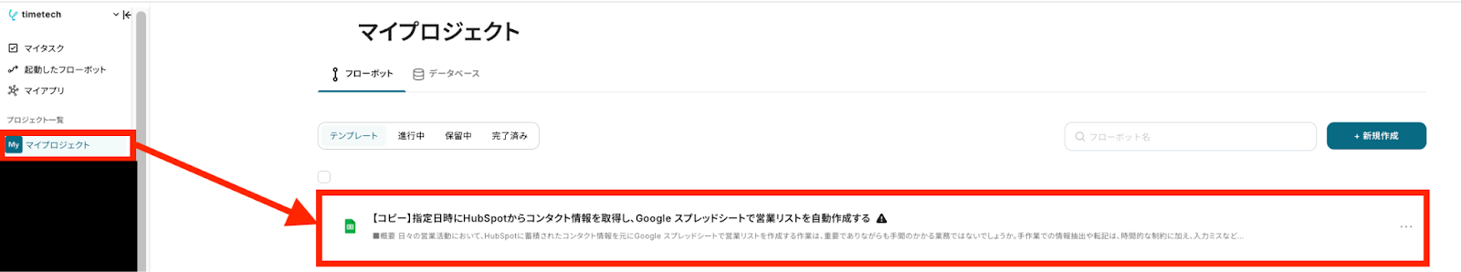 左側にあるメニューの「マイプロジェクト」から、コピーしたテンプレートを開きます。