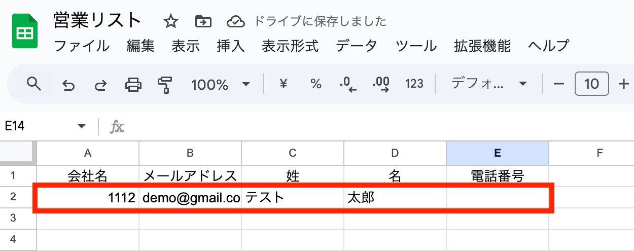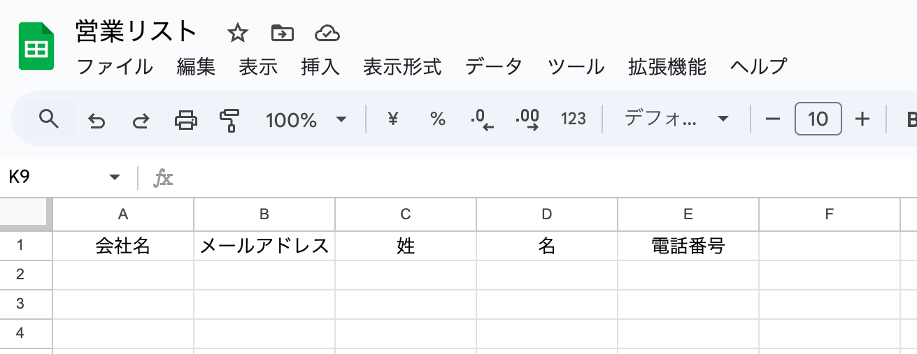 今回はテスト用に画像の通り「営業リスト」を準備しています。