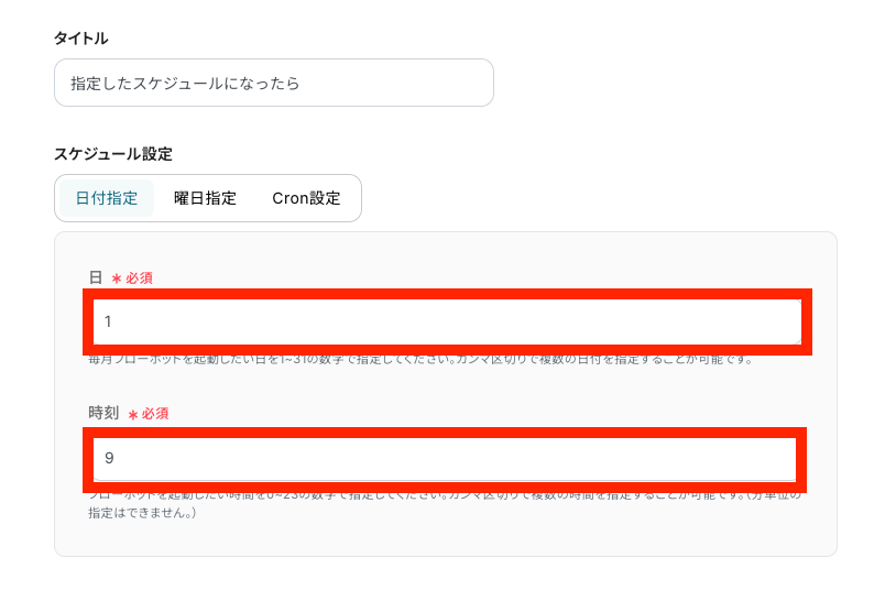 ※「Cron設定」では、1日のうちに何度も起動したい場合や、曜日によって別の時間帯に起動したいなどの細かな設定が可能です。