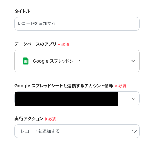 次のページに移ると「追加するレコードの値」としてGoogle スプレッドシートの項目が表示されています。