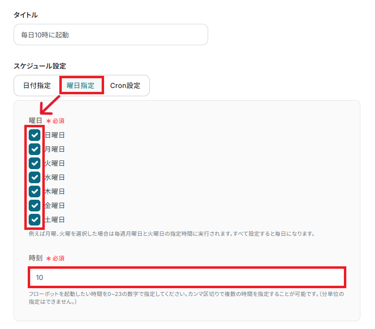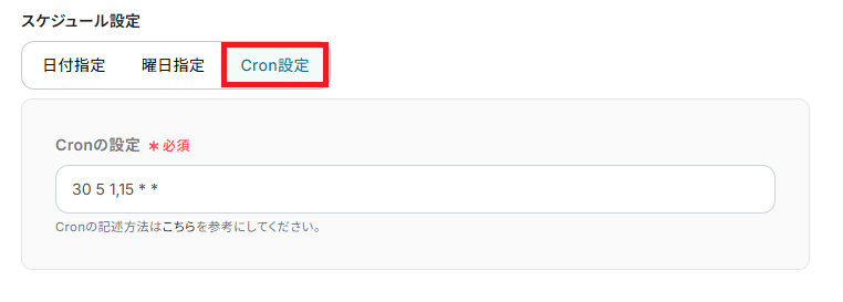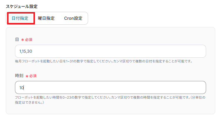曜日指定以外にも、日付指定やCron設定を使用して自由に設定することができます。