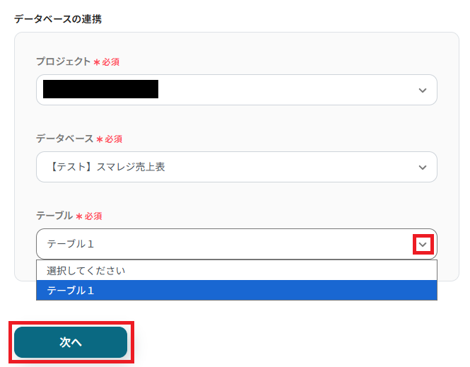 「プロジェクト」「データベース」「テーブル」は、作成したデータベースに合わせプルダウンから選択してください。