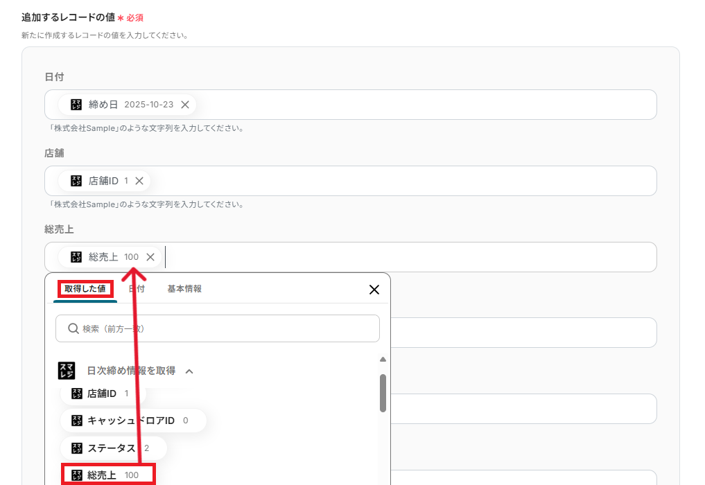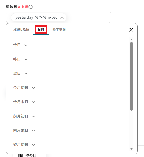 「締め日」は、テンプレートで昨日の日次締め情報を取得する項目が設定されています。