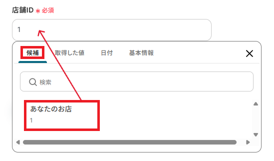 「店舗ID」は、入力欄をクリックして表示される候補から選択してください。