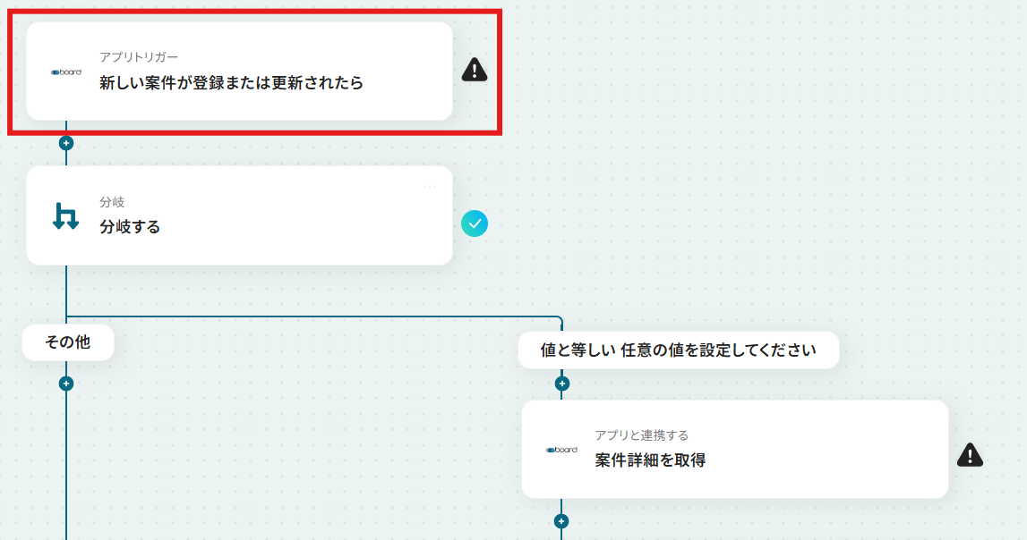 - トリガーでboardを選択し、「新しい案件が登録または更新されたら」を設定し、案件のステータス変更を検知します。